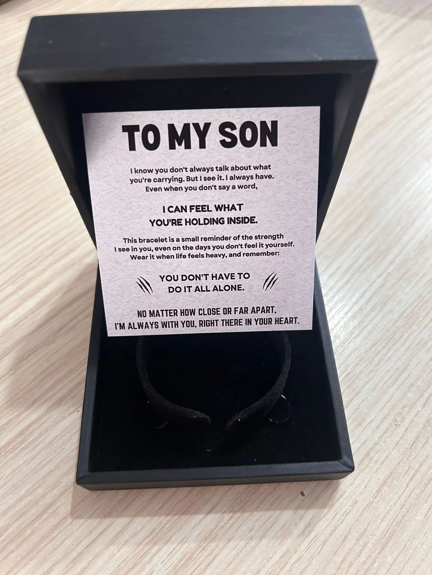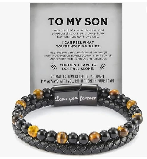 A meaningful tiger eye protection bracelet for your son, featuring natural stone beads and leather. Engraved with a heartfelt message. Perfect for Christmas, birthdays, or any special occasion.